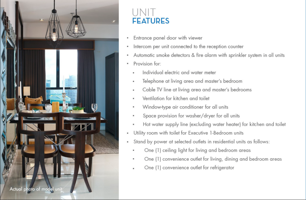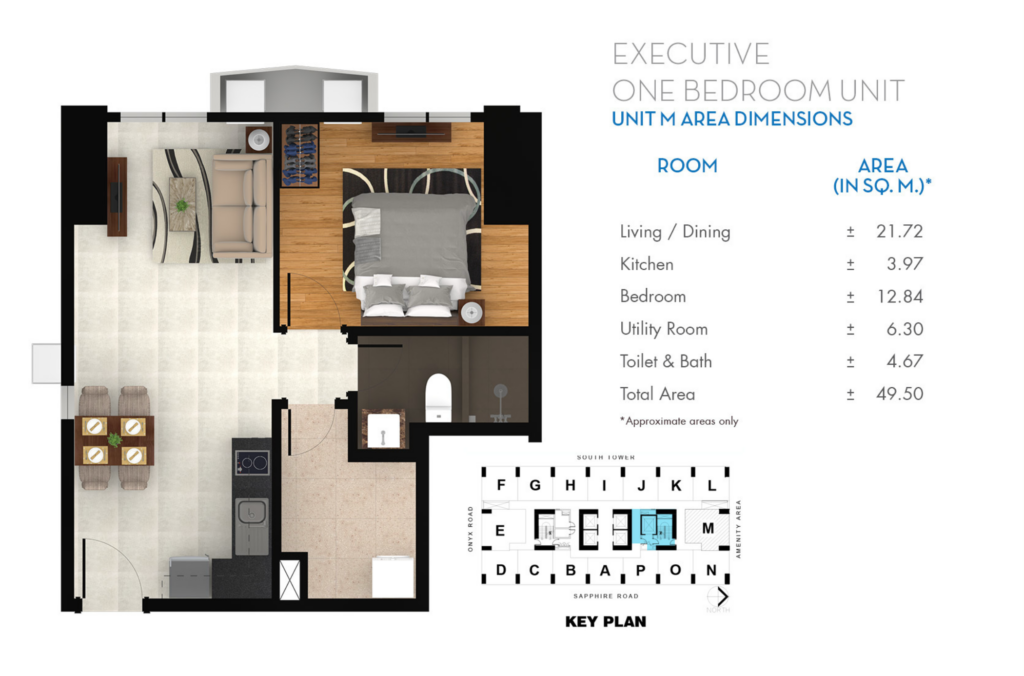 Štýlový 49 m² Executive 1-izbový apartmán v Sapphire Residences v Pasig City, ponúkajúci modernú dispozíciu a prístup k exkluzívnym zariadeniam pre prémiový mestský životný štýl.